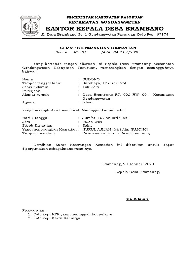 Daftar contoh surat ketarangan usaha dari desa. Formulir surat keterangan kematian (f2.29) adalah formulir yang diterbitkan oleh desa/kelurahan sebagai sebab kematian, diisi dengan salah satu angka yang dianggap benar dari pilihan yang terdapat pada. Contoh surat kematian dari desa. Surat keterangan kematian adalah surat keterangan yang menerangkan kematian atau meninggal dunia. Contoh undangan syukuran orang meninggal.